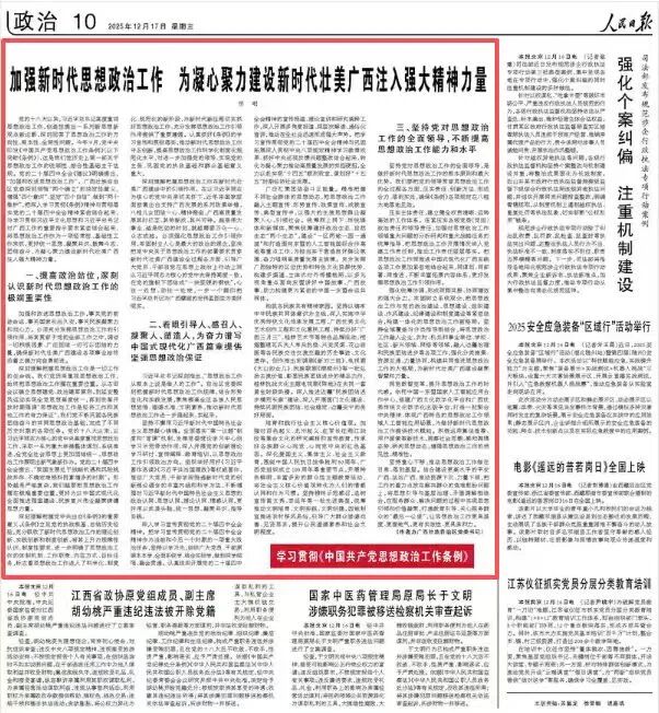 广泛汇聚团结奋斗正能量。精准把握不同社会群体的思想动态,把思想政治工作融入主题宣传、形势宣传、政策宣传、成就宣传、典型宣传中,以强大的主流思想舆论凝聚人心、引领社会。统筹网上网下、传统媒体和新媒体,聚焦统筹建好政治生态、自然生态“两个生态”,建设“一区两地一园一通道”和打造面向东盟的人工智能国际合作高地等重点工作,为担当实干营造良好舆论氛围,奋力唱响高质量发展主旋律。充分发挥广西独特的区位优势和特色文化资源优势,构建多渠道、立体式对外传播格局,以多元视角重点面向东盟讲好中国故事、广西故事,助力构建更为紧密的中国—东盟命运共同体。