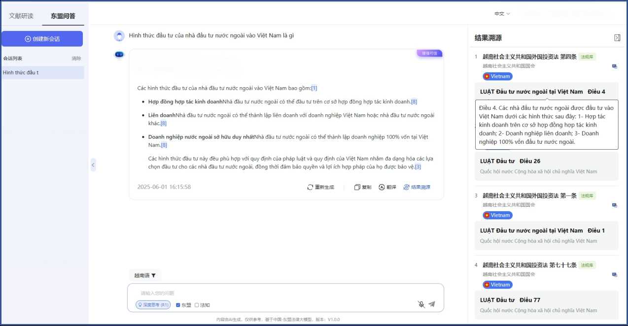 作为服务区域法治合作的创新实践,该模型重点围绕企业跨境经营、商贸争议解决、知识产权保护等实务领域,提供法律智能咨询、政策解读、风险评估等专业化服务。通过多语种互译和条文溯源功能,有效促进中国与东盟国家间的法律协同与互认。