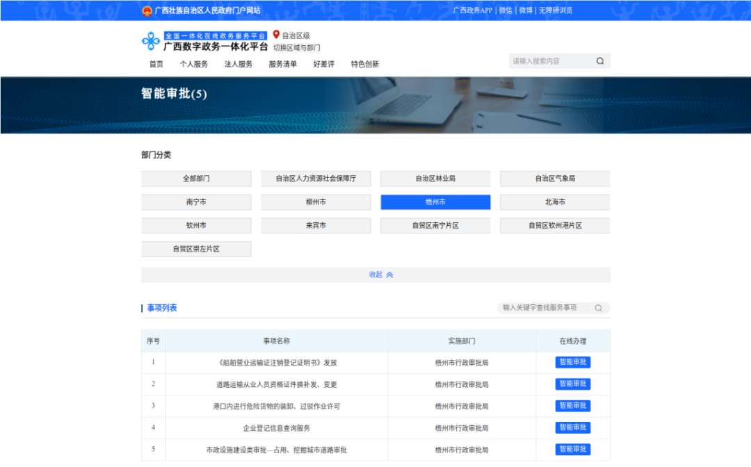 “占用城市道路”智能审批是梧州市在广西数字政务一体化平台上线运行的第五个智能审批事项。按照“成熟一个,上线一个”的原则,梧州市行政审批局持续推动政务服务事项实现智能化审批,由“工作日窗口”人工办转变为“随时随地”智能办,由核发纸质批文转变为核发电子证照,进一步提高审批效能、缩减企业办事成本。“占用城市道路”智能审批上线后,市区内200余家连锁经营企业门店申请占用城市道路审批不用再到实体大厅提交申报材料,实现“足不出店”全程网办、“24小时不打烊秒报秒批”。截至目前,梧州市行政审批局已办理“占用城市道路”智能审批业务19件。