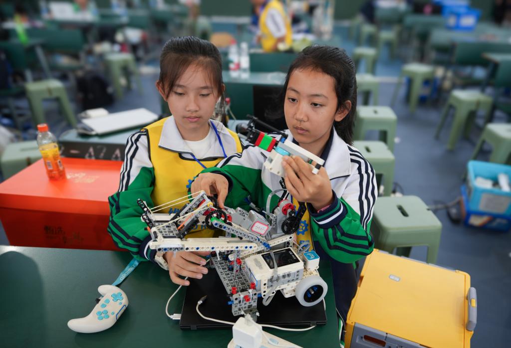5月31日,两名参赛选手在全国青少年科技教育成果展示大赛云南省区域赛上调试比赛用的机器人。新华社记者 陈欣波 摄