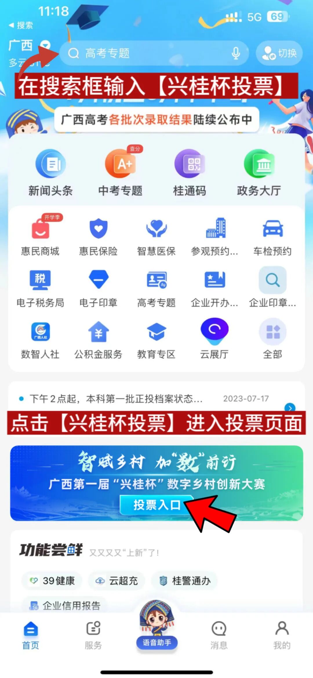 2. 在“智桂通”APP首页进入【兴桂杯投票】界面,选择你支持的参赛作品(每次可投1到5个作品),点击投票即可。