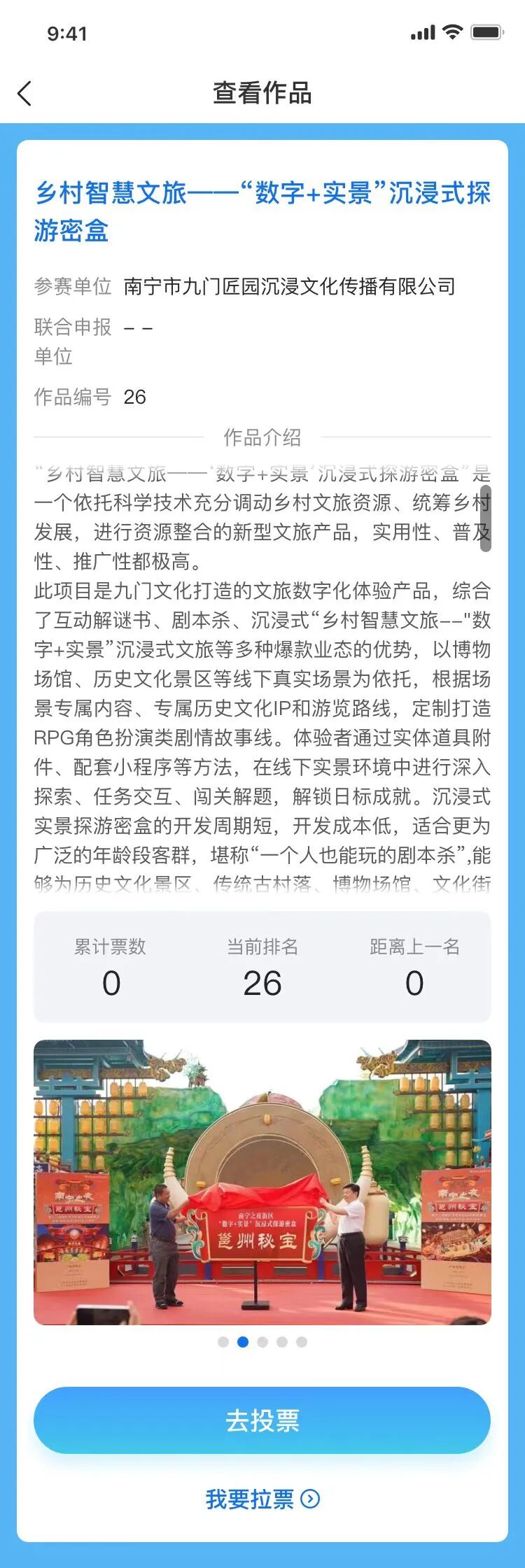 3. 若想了解参赛作品具体信息,可在搜索框输入参赛作品标题或编号,或直接点击“查看作品”,查看作品介绍、累计票数、排名等信息。