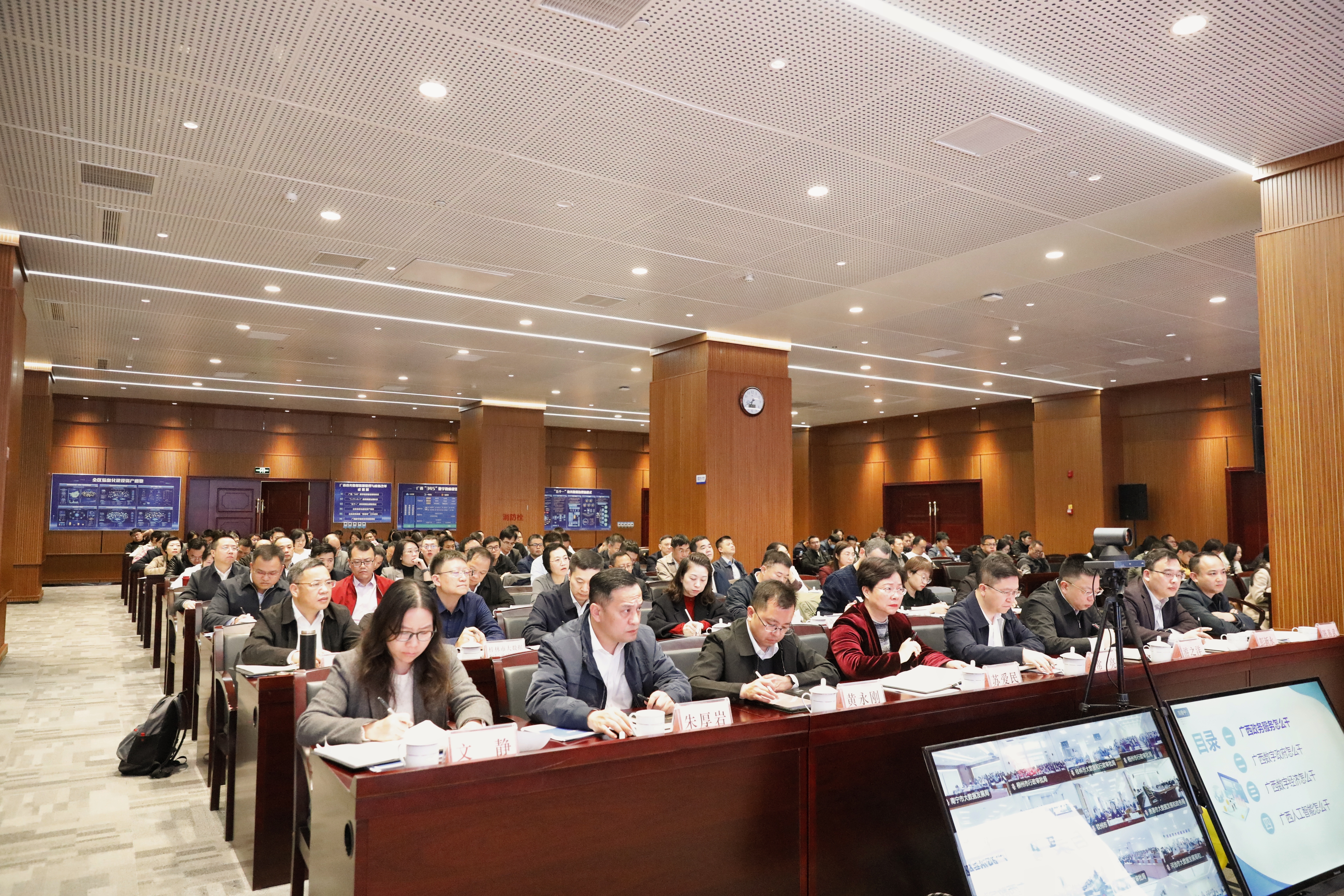 会议以线下和线上结合的方式召开,主会场方面,自治区数据局、自治区信息中心全体干部职工,以及各市大数据发展和政务服务主管部门的主要负责同志和1名科室负责人悉数到场。分会场方面,广西数据集团、中国—东盟信息港股份有限公司、数字广西集团有限公司、北投信创股份有限公司的全体干部职工,以及各设区市、各县(市、区)大数据发展和政务服务主管部门、信息中心的全体干部职工也通过视频形式积极参与了会议。