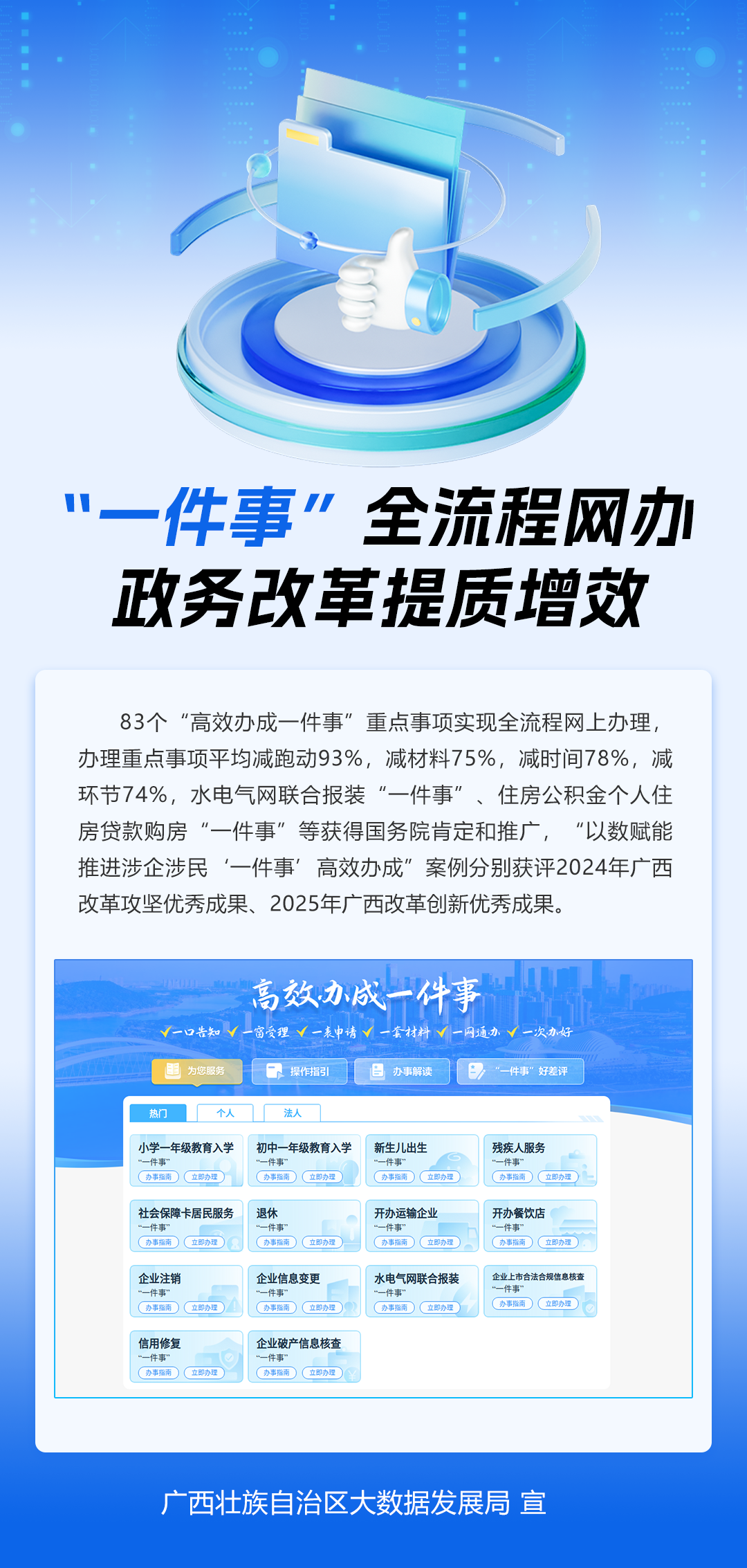 自治区数据局以数智为翼,以创新为帆,在政务服务领域精心打造出了一系列优秀案例,从政务AI新引擎提升服务智能化水平,到“智小桂”智能问答提供便捷咨询服务;从“数政大脑”实现资源的统筹管理,到“智桂通”以AI技术赋能政务新体验;再到政务服务双中心融合升级优化便民利企环境,以及“一件事”全流程网办推动政务改革提质增效等案例,不仅是自治区数据局创新实践的生动体现,更是其推动政务服务高质量发展、助力数字广西建设的坚实步伐和有力担当。