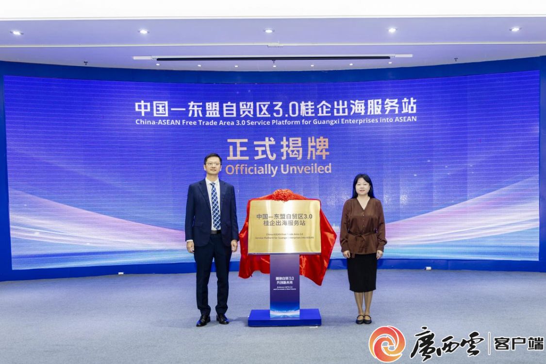 广西壮族自治区商务厅党组成员、副厅长刘祥和广西国际博览集团有限公司副总经理熊智琳共同为中国—东盟自贸区3.0桂企出海服务站揭牌。 通讯员 郭冬妮 摄
